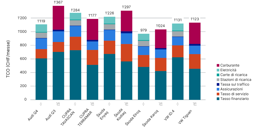 *Calcolo dei costi complessivi (TCO) mensili: Audi Q3 CHF 1367.–, Audi Q4 e-tron CHF 1019.–. Corrisponde a un risparmio sui costi del 26%, che può arrivare fino al 30% a seconda dell’utilizzo e della tariffa.